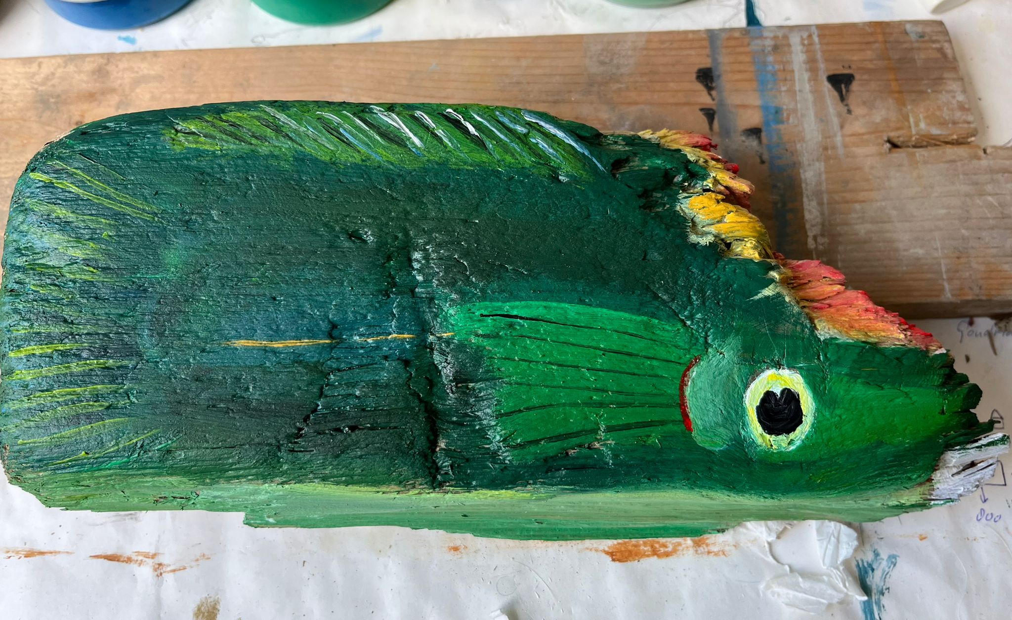 Een upcycle product! Een stuk drijfhout is gevormd door de zee en getransformeerd tot een leuke vis door Anne-Marie. Acrylverf. Afmeting 28x10 cm. Dikte 6 cm